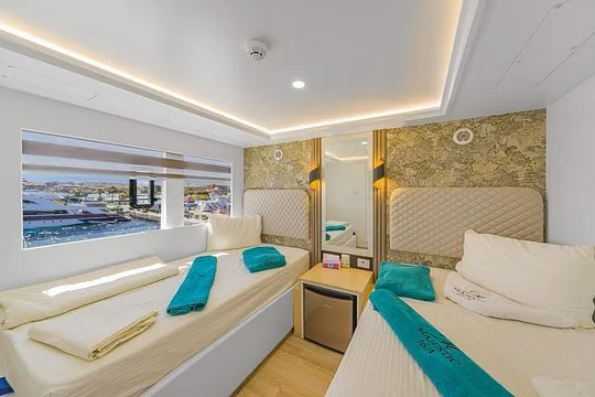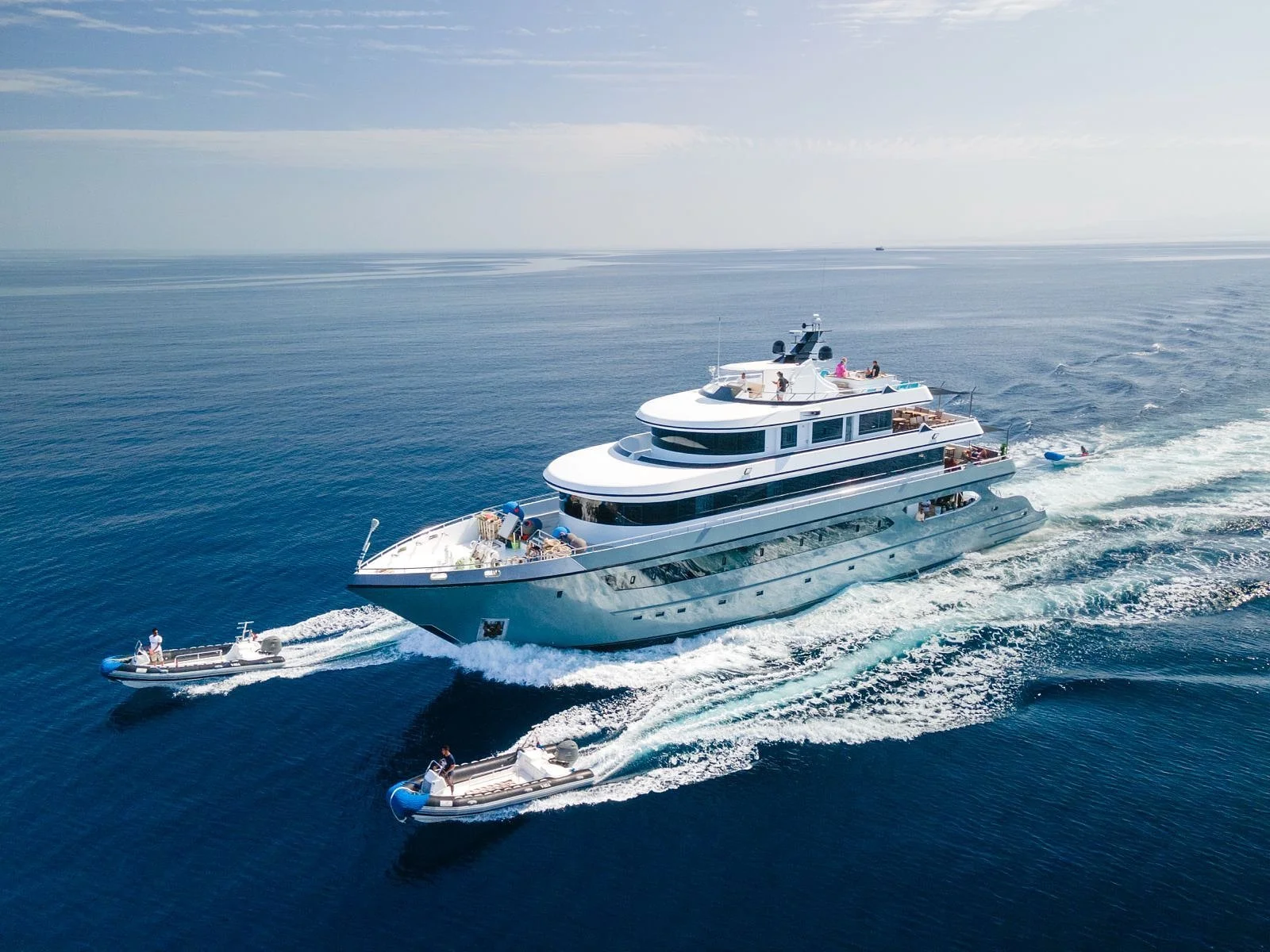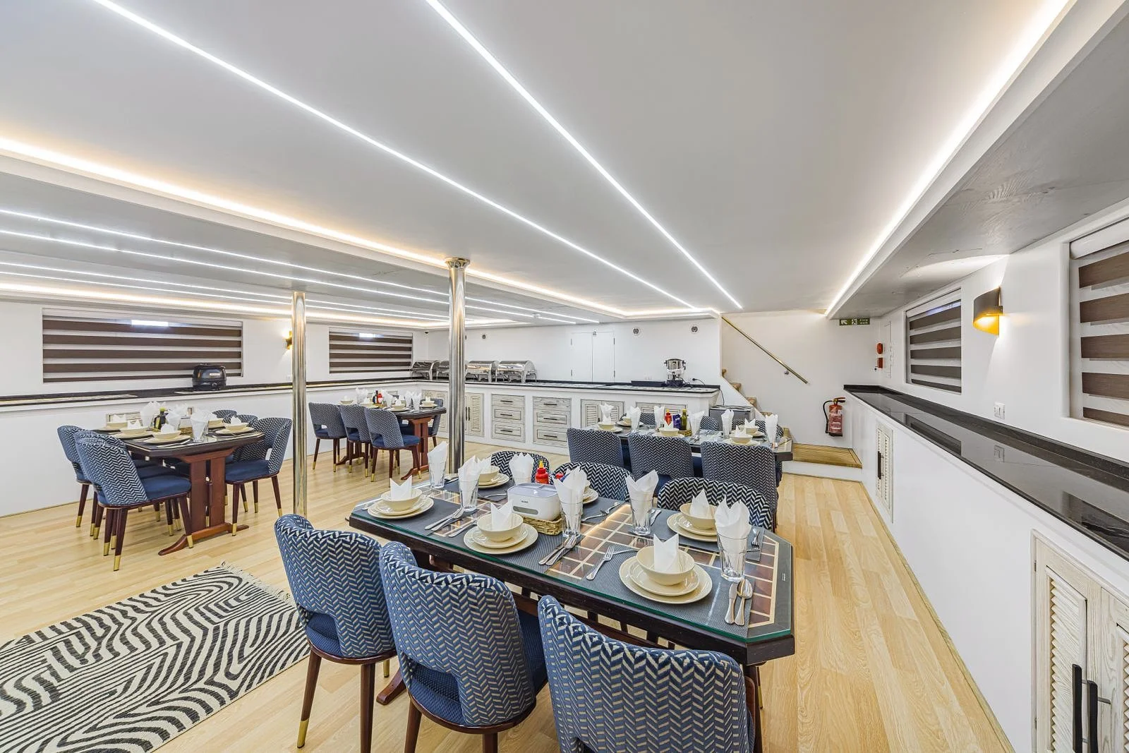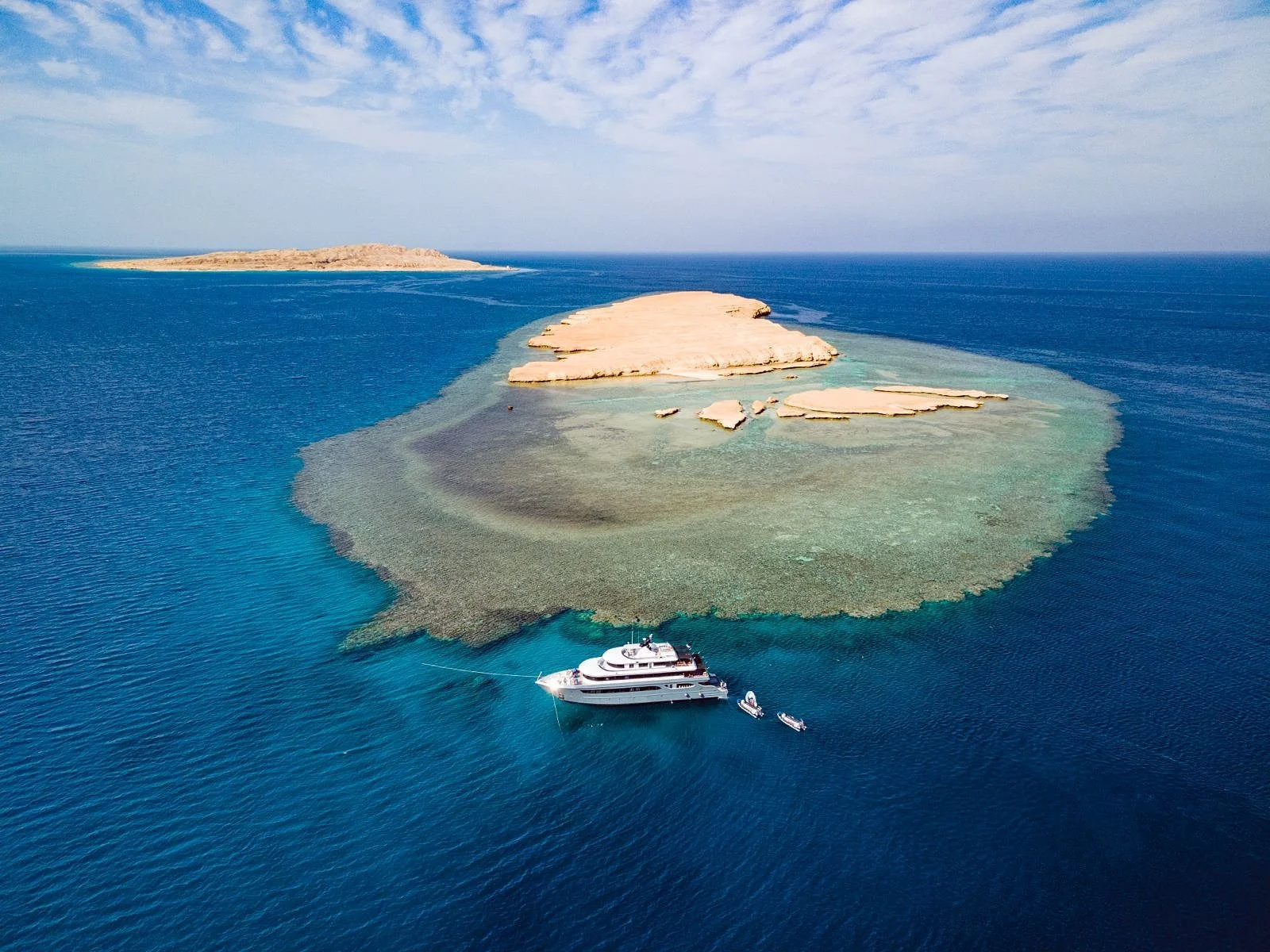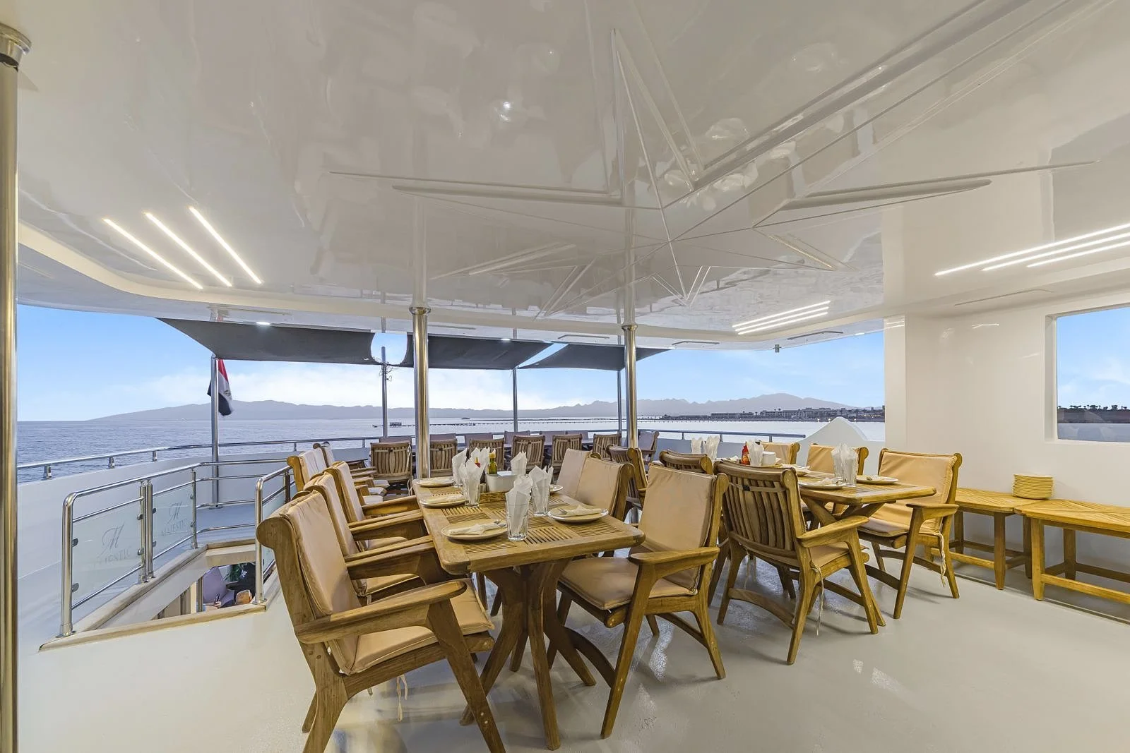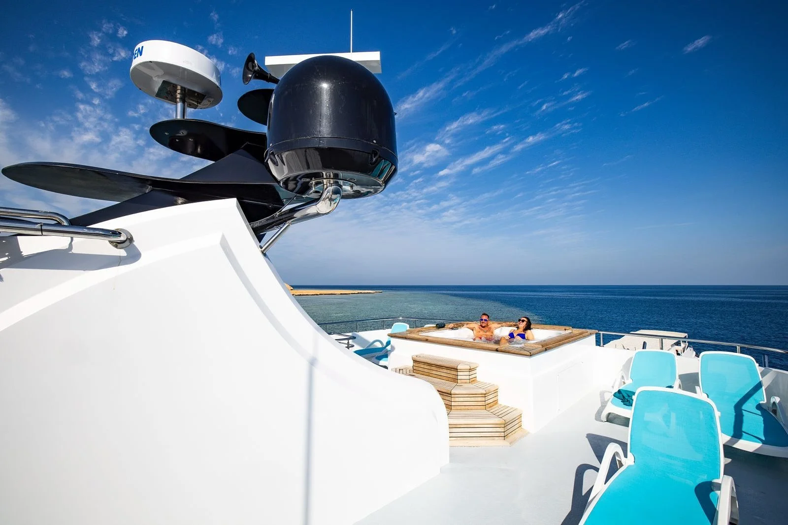 You’ll be staying on one of the best yachts on the Red Sea, a luxury vessel featuring 5 decks, 17 comfortable cabins, two air-conditioned lounges with bar and entertainment systems, sunbeds for tanning, a top-deck jacuzzi, and a shaded deck for relaxation.