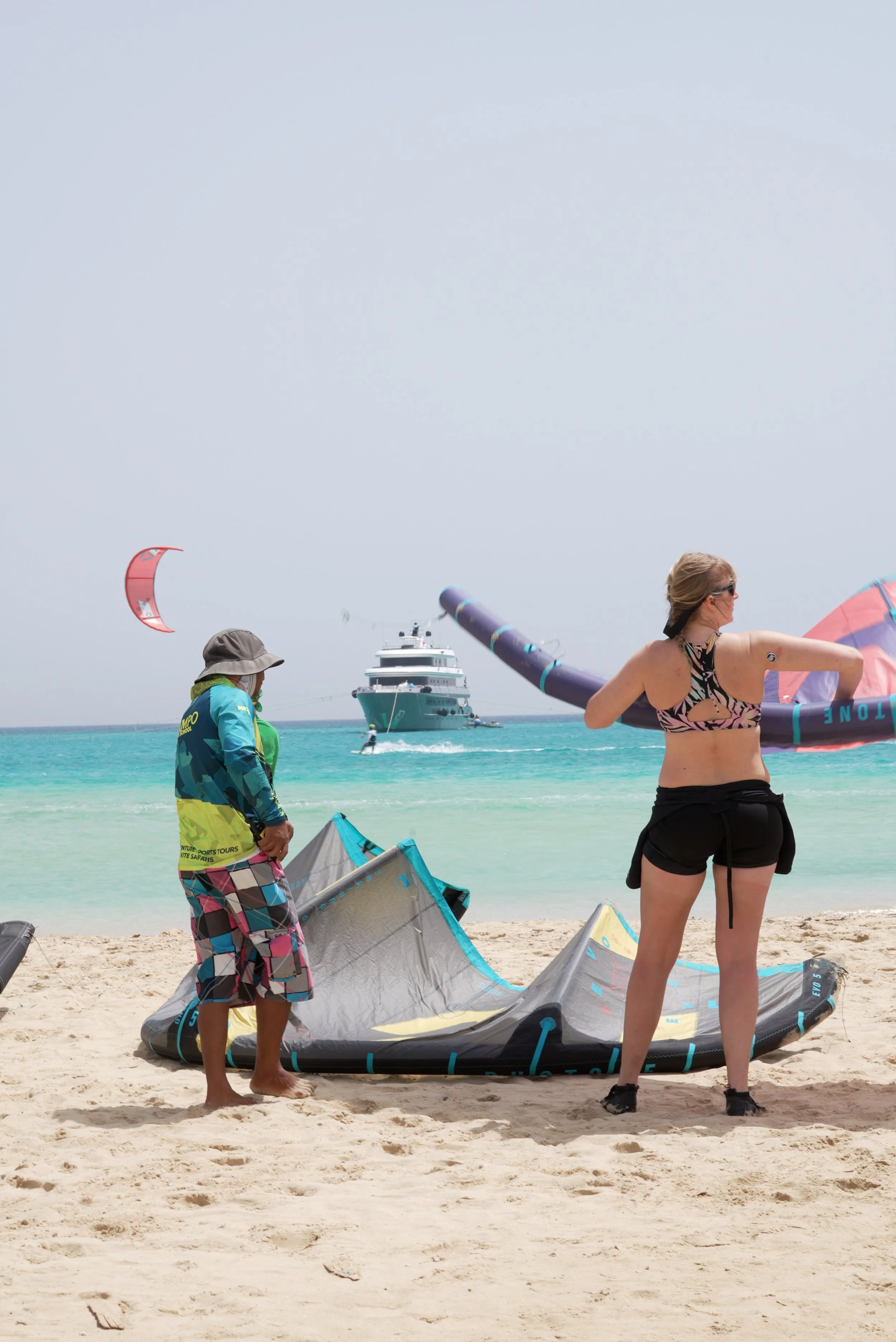• The yacht trip offers the perfect conditions for beginners and advanced riders, alike. The location of this trip has ideal conditions for beginners for the following reasons: #1 We anchor the yacht in one of the best lagoons for kite-surfing in the world - clear warm water, no beach-goers to worry about,  and plenty of space between the kite-surfers. #2 You get free rescue boat support. There are two boats available all the time to help when you are further out at sea or even close to the beach but lost your board or the kite is in the water and you are struggling. #3 There will be about 20 of us on board with about 5 to 10 beginners. #4 Our instructors only work with radio helmets, so they will guide you in real time on how to improve your posture and riding, thus significantly shortening the learning curve. You can spend more than the cost of this trip on other instructors teaching you something on the beach for weeks, while you can learn with us for 2 days and spend the other 4-5 days learning on your own and making use of the boats when needed. #5 Because of the rescue boats and the ability to anchor at different locations, we ride in all wind directions, thus again making use of all the time you are out there.